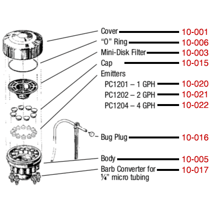 DIG's Maverick™ High Flow 12-Outlet Drip Kits are used to retrofit an existing 1/2” sprinkler riser into a 12-outlet drip irrigation system without altering or increasing the flow of the sprinkler system zone. The 12-outlet drip manifold in the kits utilizes extremely accurate, pressure compensating individual and interchangeable nozzles to ensure equal flow from each outlet over a wide range of operating pressures from 10 to 80 PSI. The kits allow installation flexibility when incorporated into a new system. Each kit contains a 12-outlet manifold with 4 GPH pressure compensating drip emitters, 12 stakes, 8 caps, 12 bug plugs and 12 color-coded converter barbs to convert the 1/8” outlet into a 1/4” outlet for use with 1/4” micro tubing.